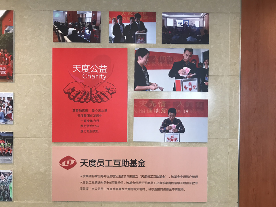 每一分榮譽證書的背后,都離不開為集團默默付出的員工。天度集團也珍視每一位員工,特別在集團內(nèi)部設(shè)立“天度公益”,一個只屬于天度員工的互助基金,賬戶管理由全體員工投票選出三位同事?lián)?,當公司員工及家屬發(fā)生重病或災害時,可以直接向該基金申請救助!